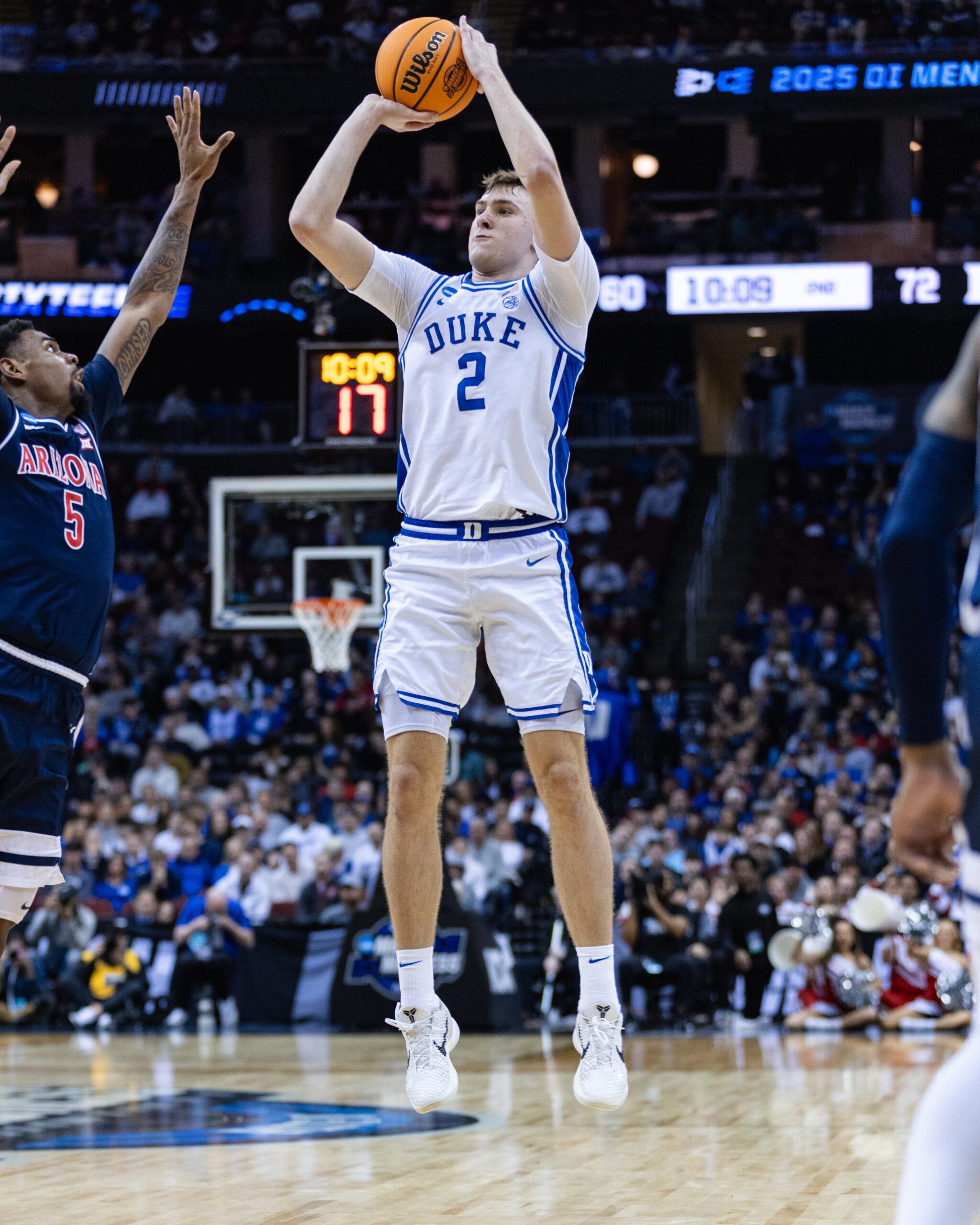 And with five minutes left, Flagg made a huge defensive play, rejecting a shot from Arizona guard KJ Lewis and sending the ball into the row of Arizona cheerleaders, igniting the Duke crowd.