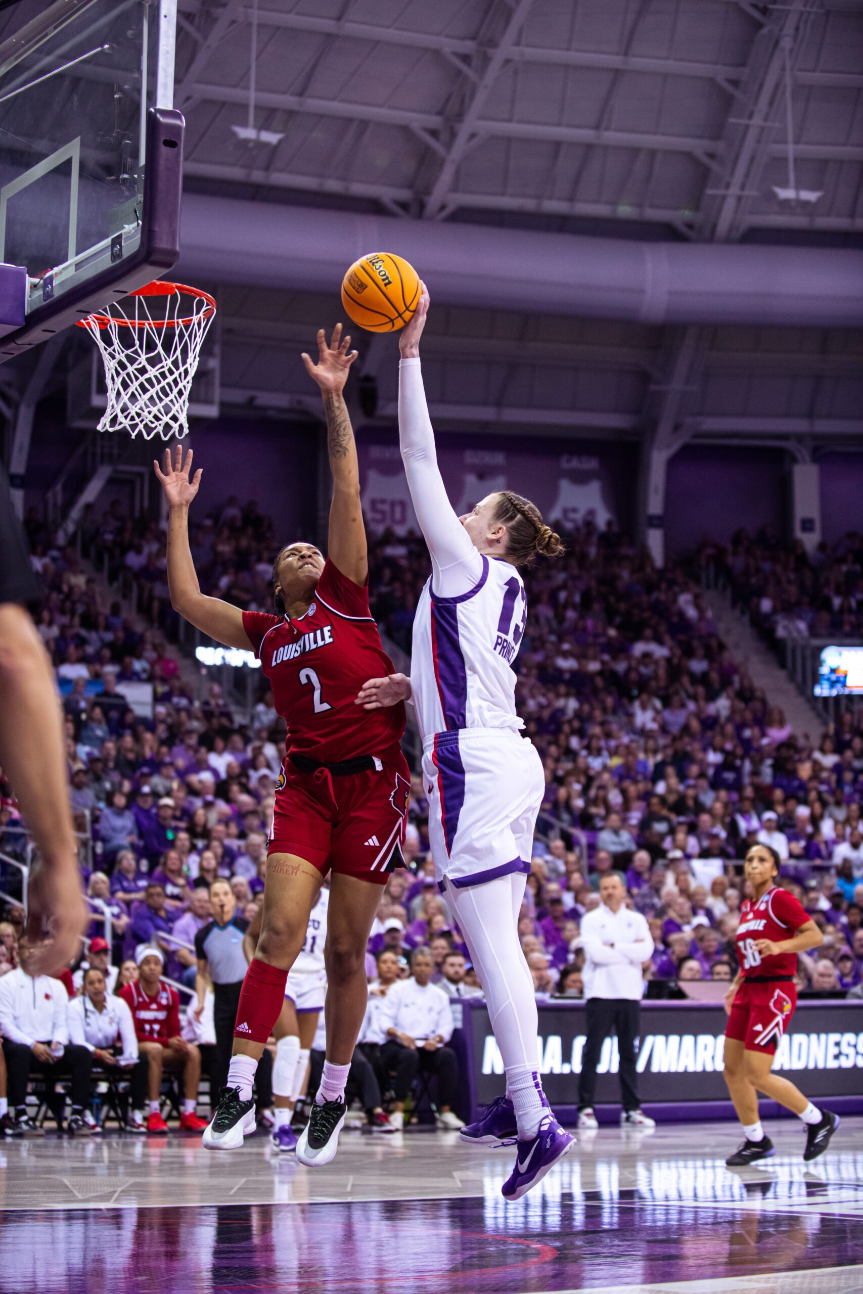 Despite Louisville’s pressure defense, TCU maintained its composure. Olivia Cochran and Nnopu traded baskets in the paint, with Cochran even hitting an and-one, but TCU’s offensive onslaught kept coming. Baskets from Van Lith and Prince, along with three-pointers from Conner and Nnopu, pushed TCU’s lead to 47-26 at the half, the largest margin of the game.
