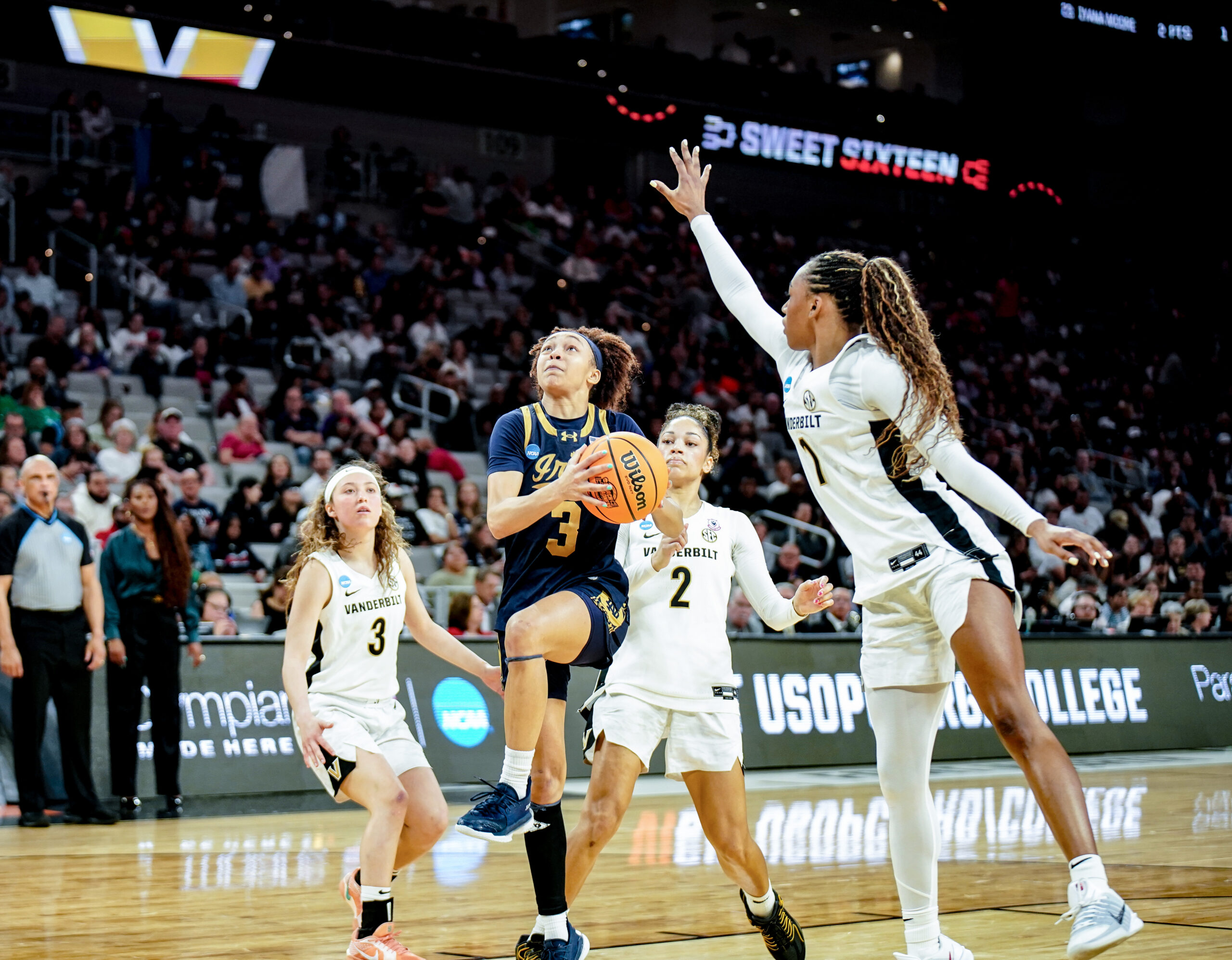 Her defensive dominance changed the game early. During a key stretch in the second quarter, Hidalgo ripped the ball away from a Vanderbilt player for a breakaway layup, then intercepted another pass moments later. A third steal in quick succession led to yet another easy basket, helping Notre Dame build a double-digit lead.