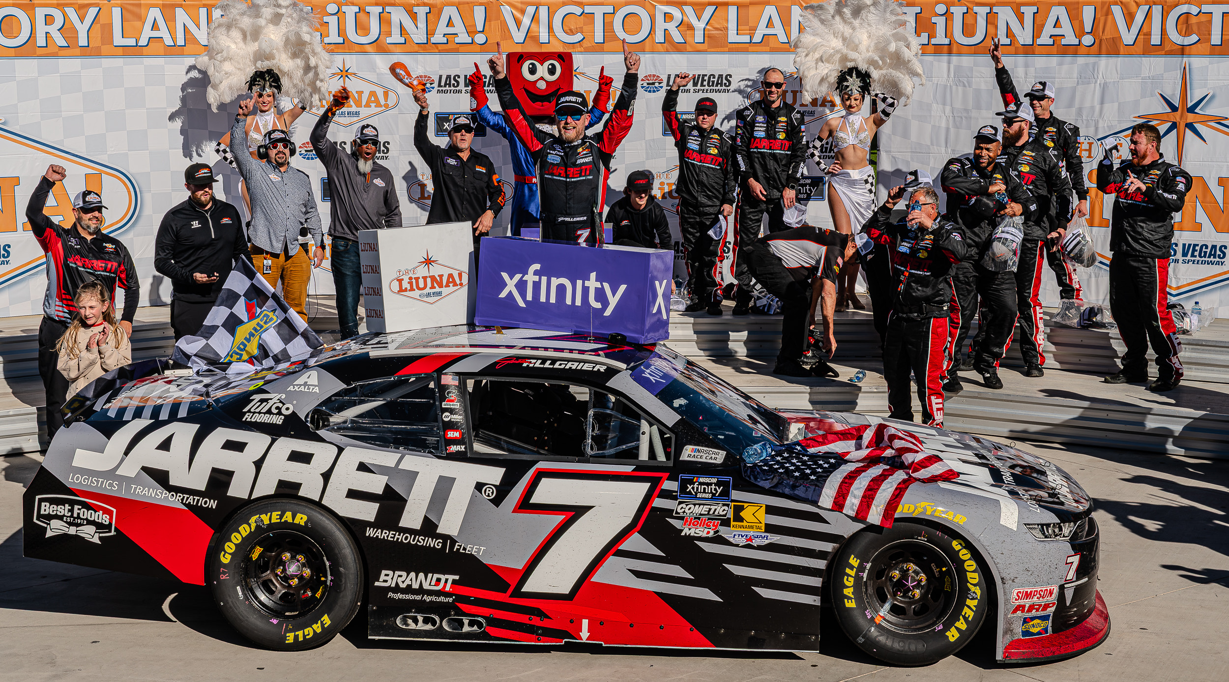 Las Vegas, NV – Justin Allgaier showcased his skill and determination at Las Vegas Motor Speedway, clinching his first NASCAR Xfinity Series victory of the season at the LiUNA! 300. Piloting the No. 7 Chevrolet for Jarrett Logistics, Allgaier’s dominant performance solidified his position as a top contender for the championship.