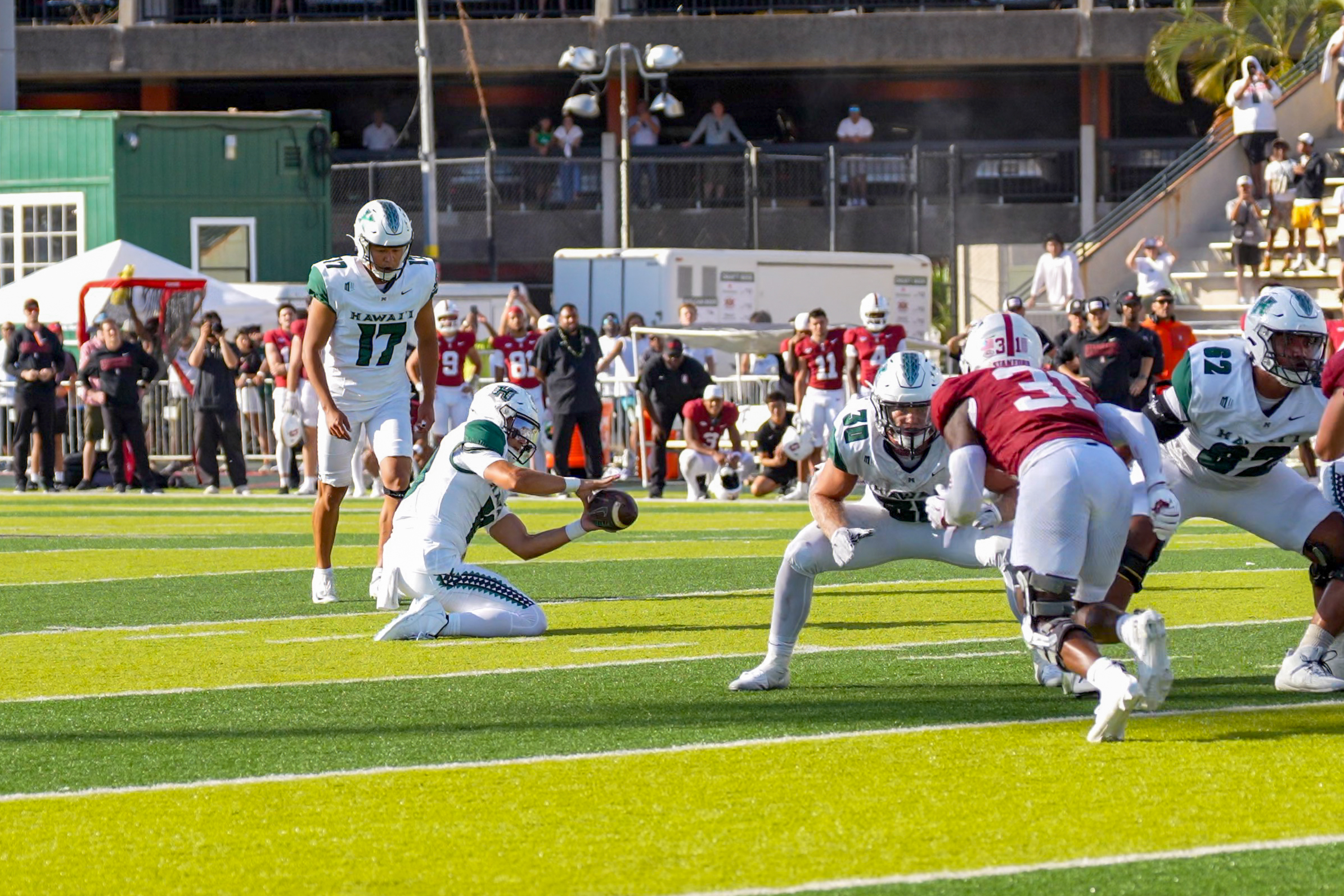 The game didn’t start in Hawaii’s favor. After a 23-yard field goal from Emmet Kenney, a miscue on the ensuing kickoff pinned Hawaii at the 1-yard line. On the next snap, Alejado was strip-sacked by Clay Patterson, and Wilfredo Aybar recovered the fumble in the end zone to give Stanford a quick 10-0 lead.