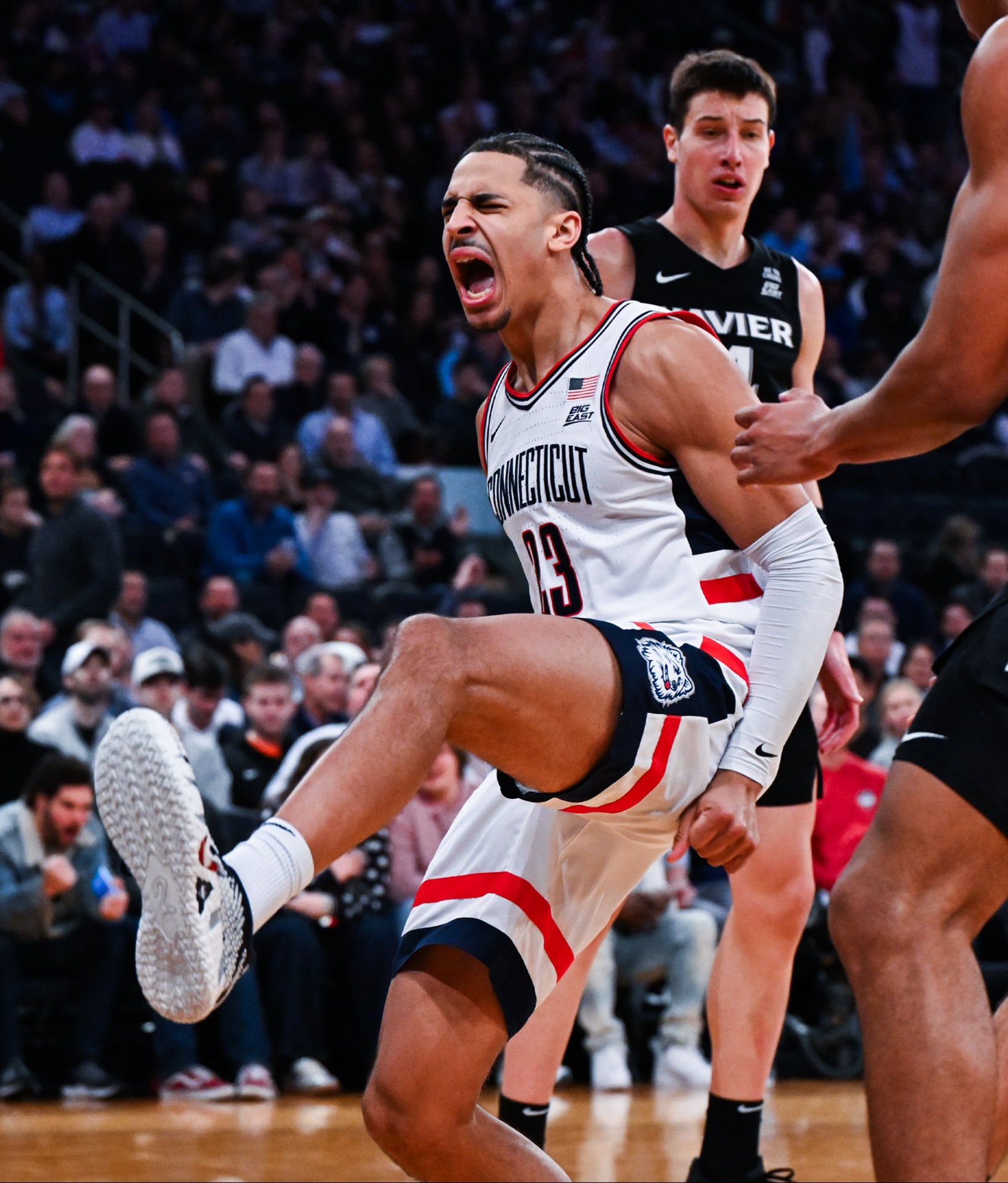 New York, NY—– UConn Huskies bounced back in dominant fashion Thursday night, rolling past the Xavier Musketeers 93–68 in the quarterfinals of the Big East Tournament at Madison Square Garden.