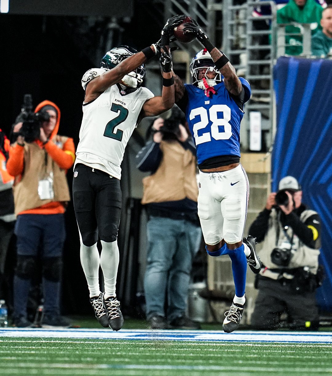 The Giants’ defense matched the offense’s energy. Brian Burns registered two sacks, tying him for the NFL lead with seven, and Cor’Dale Flott sealed the win with a 68-yard interception return — Jalen Hurts’ first pick of the season.
