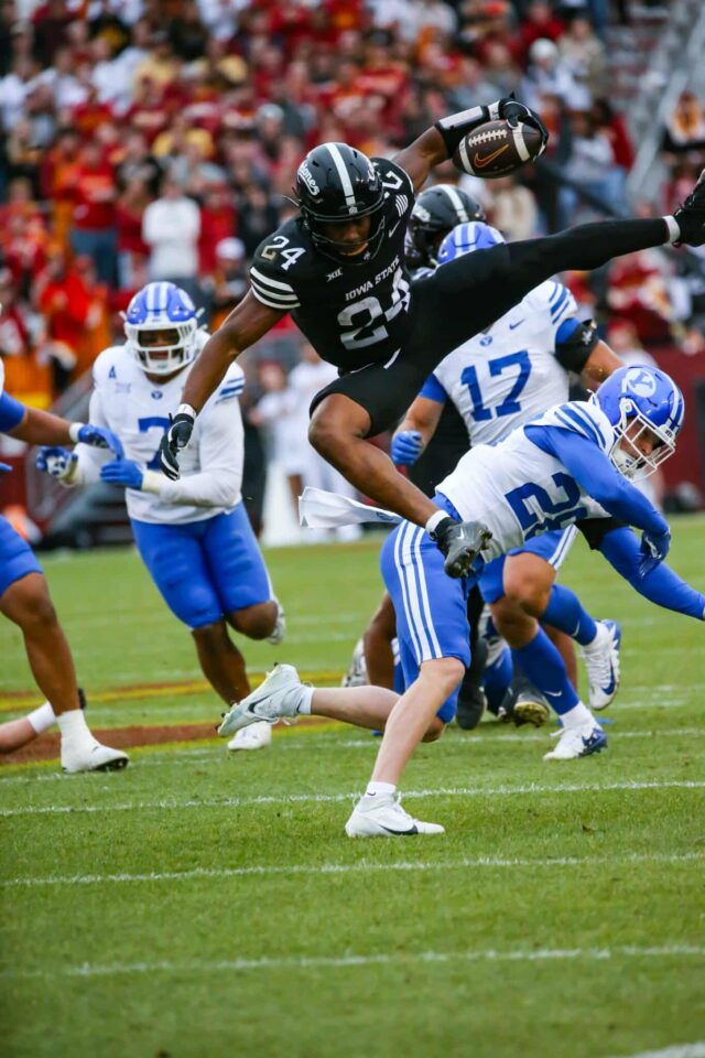 It wasn’t easy for BYU early on. The Cougars fell behind 24–10 late in the first half, undone by penalties and a pair of stalled drives. Iowa State’s Carson Hansen looked unstoppable, gashing the defense for 152 rushing yards and two touchdowns, giving the Cyclones firm control midway through the game.