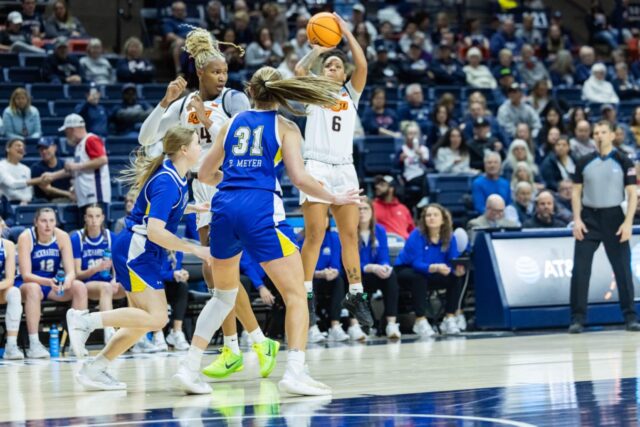 Storrs, Ct–In a thrilling first-round matchup of the NCAA Women’s Basketball Tournament on Saturday, the No. 10 seed South Dakota State Jackrabbits upset the No. 7 seed Oklahoma State Cowgirls with a 74-68 victory at Harry A. Gampel Pavilion.