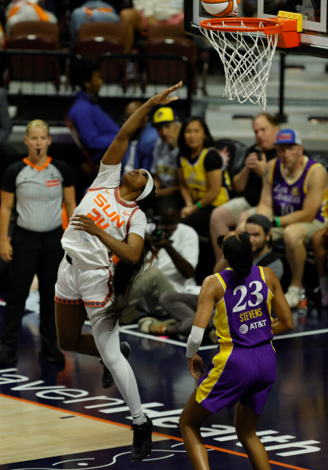 Uncasville, CT - July 24: Aneesah Morrow (24) of the Connecticut Sun scores on reverse layup as Azura Stevens (23) of the Los Angeles Sparks watches during a game between Connecticut Sun and Los Angeles Sparks, July 24, 2025./Photo Credit:Christopher Winslow