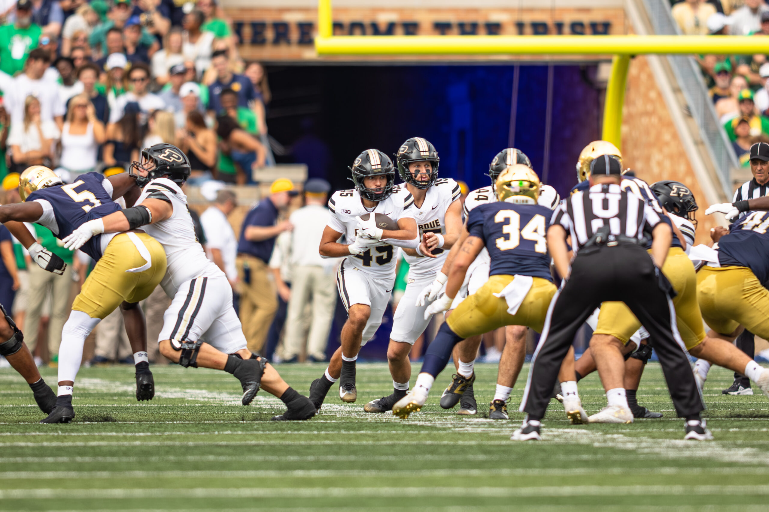 On the next series, Purdue’s defense came up with a big play when Myles Slusher sacked Irish quarterback CJ Carr and jarred the ball loose. Teammate CJ Nunnally pounced on the fumble at the Notre Dame 19-yard line, giving the Boilermakers prime field position.