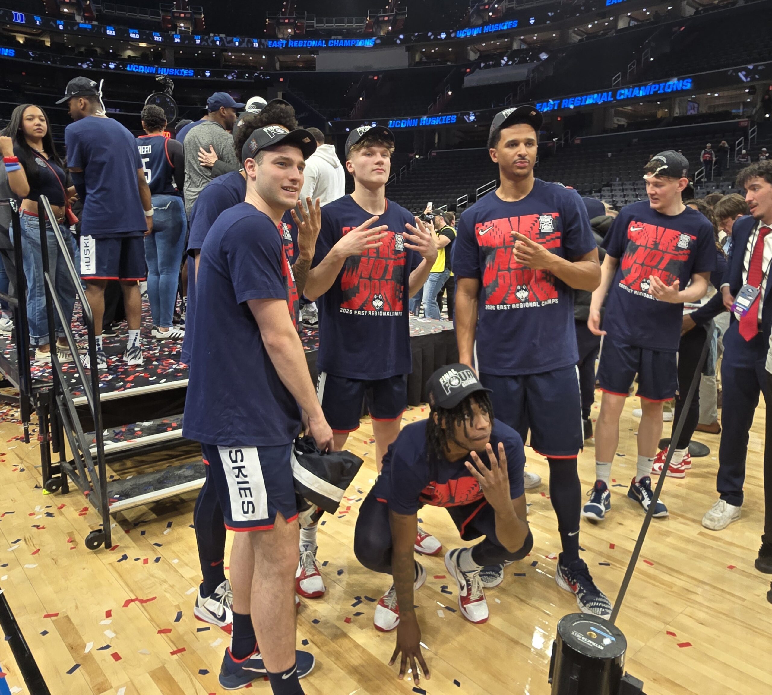 Trailing by as many as 19 points and struggling to find any rhythm from beyond the arc, the second-seeded Huskies stormed back to defeat top overall seed Duke 73-72 in the Elite Eight — winning it on a dramatic three-pointer from freshman Braylon Mullins with just 0.4 seconds remaining.