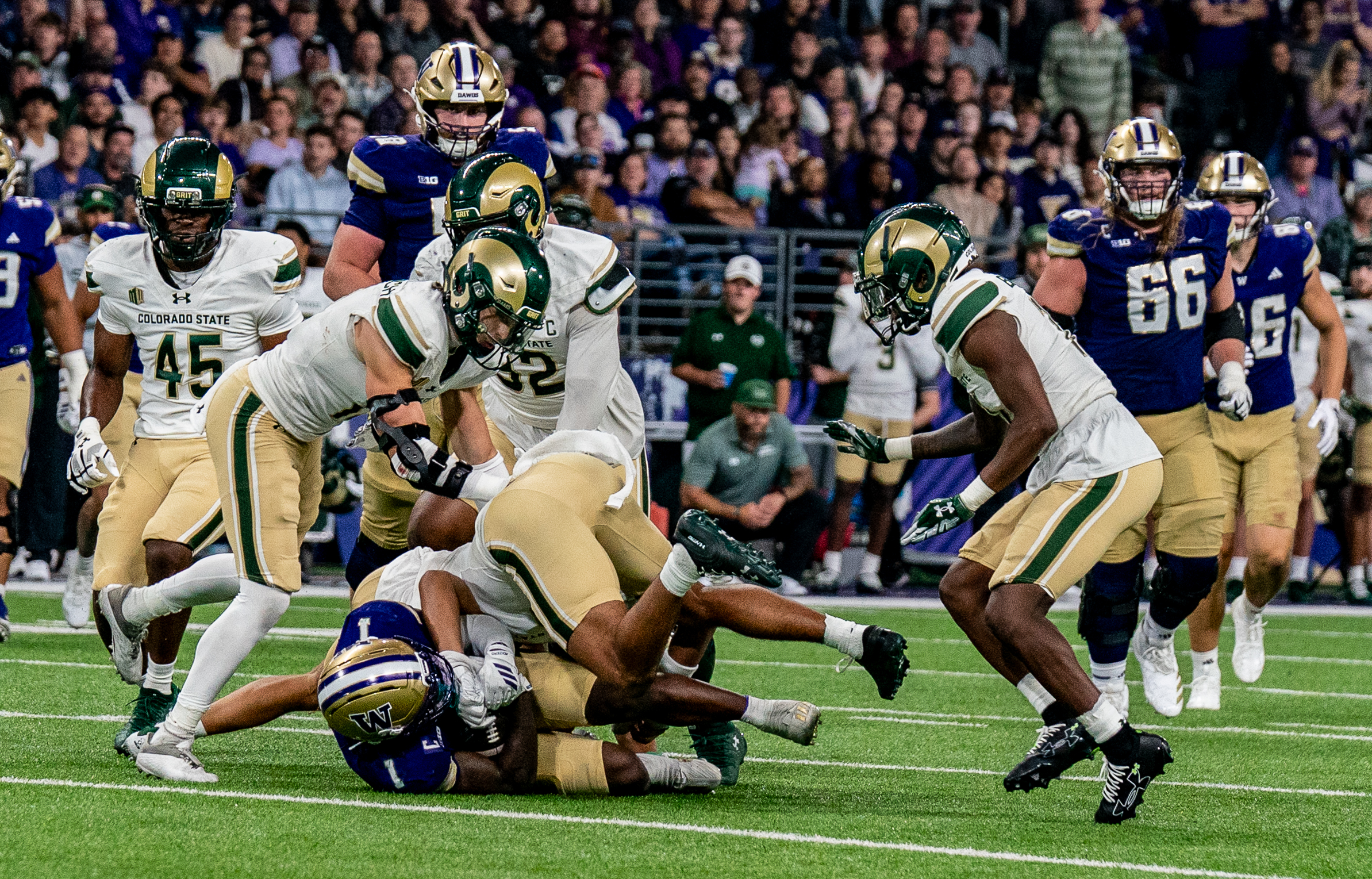 Though Washington consistently found the end zone, Colorado State refused to fold early. Each of the Huskies’ first three touchdowns was followed by an answer from the Rams. A bobbled snap by Williams deep in Washington territory late in the second quarter set up a Jalen Dupree touchdown run that knotted the score at 14–14 heading into halftime.