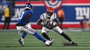 Burrow’s performance was instrumental in maintaining the Bengals’ momentum throughout the first half. Completing 19 of his 28 passes, he displayed a mix of precision and poise, effectively moving the chains and keeping the Giants’ defense on its toes. His ability to extend plays and make crucial throws was evident, as he connected with key receivers and kept the offense fluid.