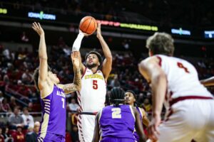 Freshman Milan Momcilovic stole the spotlight, drilling his first eight 3-point attempts and finishing with 27 points. The Cyclones hit 22 triples as a team — the most in school history — and shot a staggering 70.8% from the floor and 73.3% from beyond the arc, the highest marks of head coach T.J. Otzelberger’s tenure.