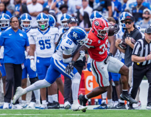 Receiver London Humphreys also made a crucial special teams play late in the first half. After a 60-yard punt by Brett Thorson, Humphreys saved it from becoming a touchback by knocking it out of bounds at Kentucky’s 1-yard line. The Wildcats quickly went three-and-out, setting Georgia up for a short-field touchdown on Bell’s first score of the day.