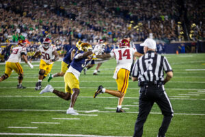 USC’s Isaiah Rubin, #38, with the crushing hit on Notre Dame’s Jadarian Price. Photo Credit: Michael Sanders