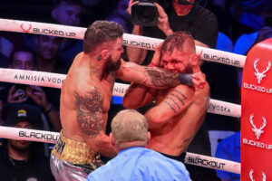 Newark, NJ – October 04: Mike Perry delivers the knockout punch to Jeremy Stephens during the BKFC 82 event at the Prudential Center on October 04, 2025 in Newark, New Jersey. (Photo by Tim Hadorn/4.0 Sports Media).
