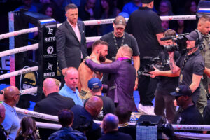 Newark, NJ – October 04: Conner McGregor congratulates Mike Perry during the BKFC 82 event at the Prudential Center on October 04, 2025 in Newark, New Jersey. (Photo by Tim Hadorn/4.0 Sports Media).