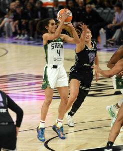 Sunday’s sold-out crowd of 18,064 — Golden State’s 10th straight home sellout — featured several high-profile fans, including NBA superstar Stephen Curry, South Carolina head coach Dawn Staley, former Storm legend Sue Bird, and U.S. soccer icon Megan Rapinoe.